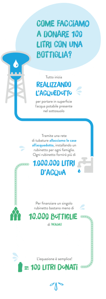 Quella che è nato come una semplice idea è diventato un nuovo modo di bere acqua che può, con il contributo di tutti, cambiare la vita di tanti. Ogni bottiglia di WAMI infatti contribuisce alla realizzazione di progetti idrici in villaggi bisognosi. Quando una comunità riceve l’acqua potabile cambia tutto! Migliorano le condizioni di salute, la disponibilità di cibo, l’istruzione e l’economia locale.