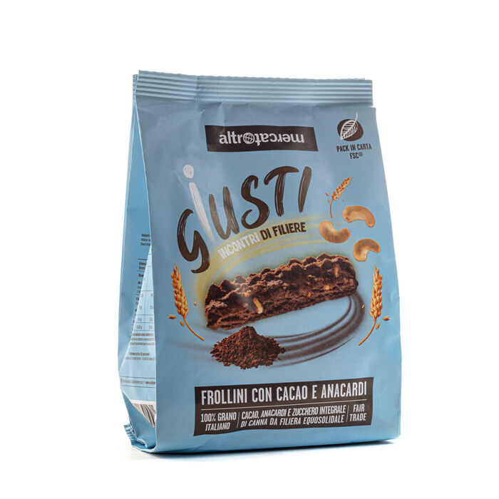 Nei frollini con cacao e anacardi, la croccantezza degli anacardi crea con il cacao il giusto connubio di emozioni per un mix indimenticabile. Farine 100% italiane impastate con sole uova da galline allevate all’aperto e senza olio di palma. Perfetti da inzuppare, ideali per un dolce risveglio, per un tè pomeridiano o una merenda. Confezionati in pack carta 100% riciclabile.