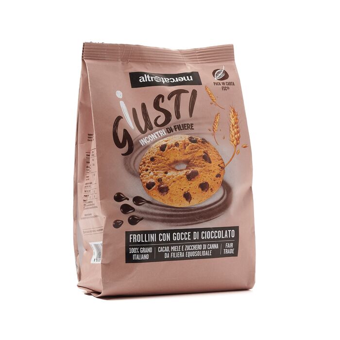 Nei frollini con gocce di cioccolato, l’intenso sapore delle gocce di puro cioccolato si unisce quello dolce di miele e zucchero di canna. Questi frollini sono ottenuti con sole uova da galline allevate all’aperto e grano 100%italiano. La qualità e la genuinità degli ingredienti, impastati e modellati con cura, portano sulla tua tavola frollini golosi e friabili, perfetti da inzuppare, ideali per un dolce risveglio, per un tè pomeridiano o una merenda. Confezionati in pack carta 100% riciclabile.