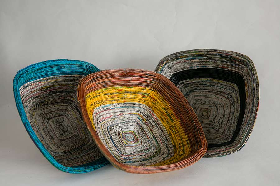 Cesto in carta di giornale riciclata grande 27x27x9cm. Disponibile in moltissimi colori che non è possibile scegliere acquistando online.