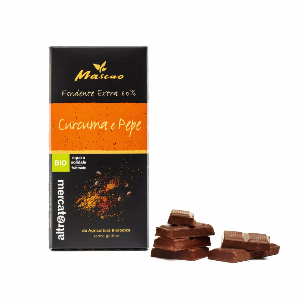 Un cioccolato biologico pensato per chi cerca la bontà e vuole sperimentare nuovi sapori e accostamenti. Il cioccolato Mascao con zucchero integrale di canna Mascobado incontra l’inconfondibile aroma della curcuma e la gradevole piccantezza del pepe, dando vita ad una tavoletta preziosa, dalle note speziate mai eccessive e di grande equilibrio.
