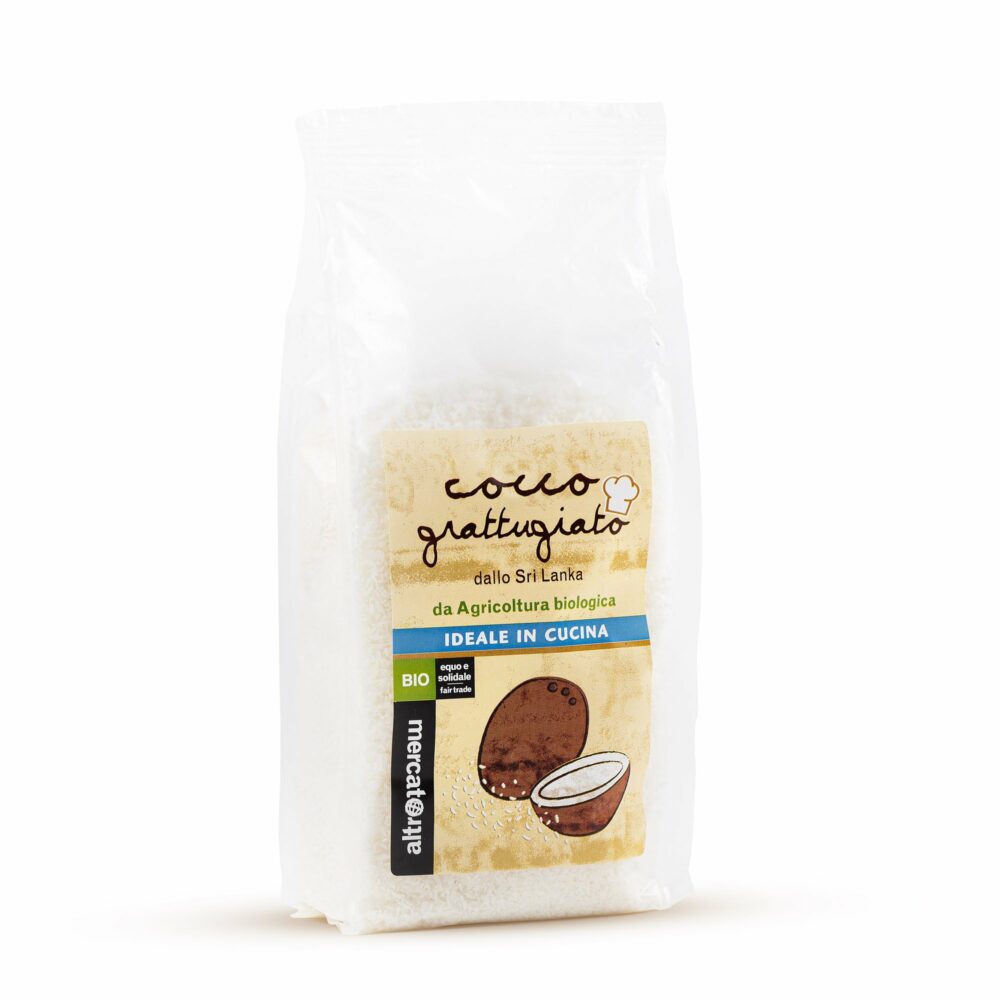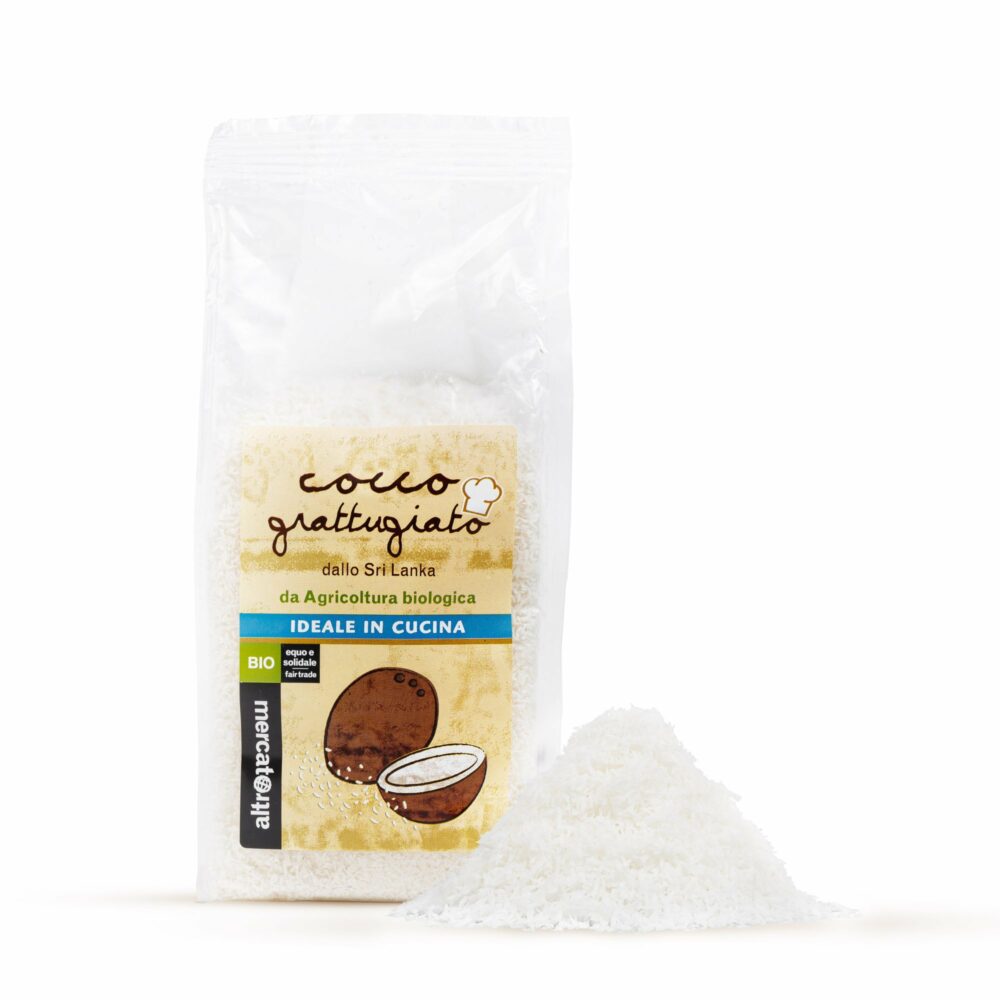 Cocco grattugiato essiccato da Agricoltura biologica 100% da Commercio Equo Prodotto confezionato in Atmosfera protettiva