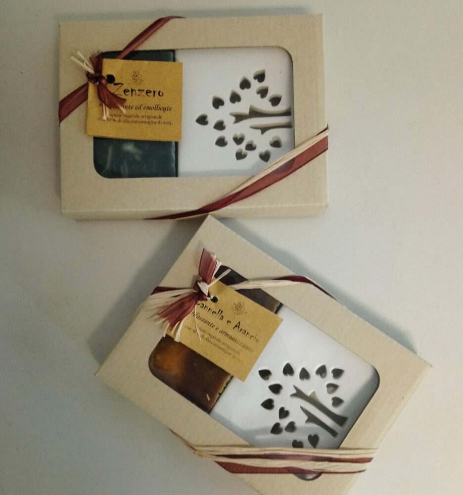 Scatola con all’interno un portasapone bianco in ceramica e una saponetta da 100g in diverse profumazioni, non selezionabili.