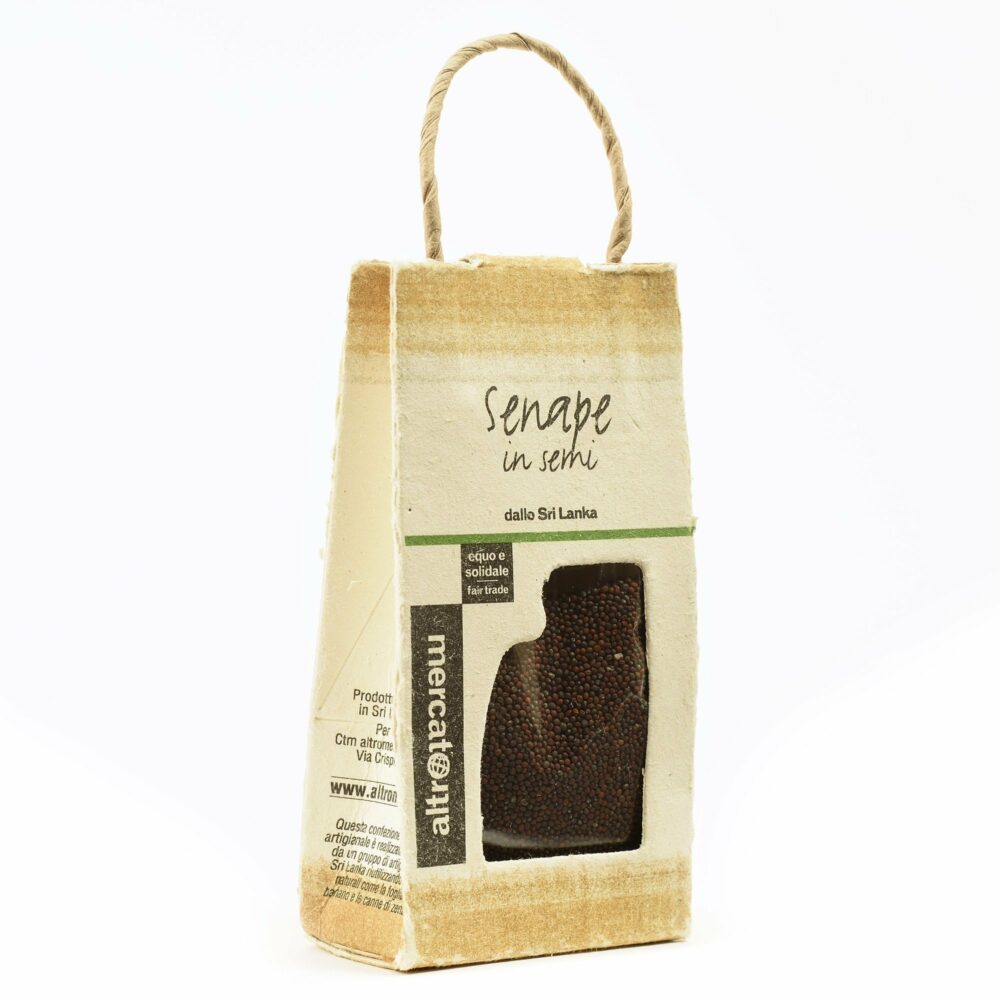 La senape Altromercato viene coltivata nella giungla a Nord dello Sri Lanka. Ha grani piccoli molto aromatici e piccanti, viene raccolta a primavera. La confezione è realizzata artigianalmente in carta fatta a mano a partire da fibre naturali. All’interno trovi alcune ricette da provare con questa spezia. Abbinamenti: cereali, formaggi freschi o pietanze a base di verdura.
