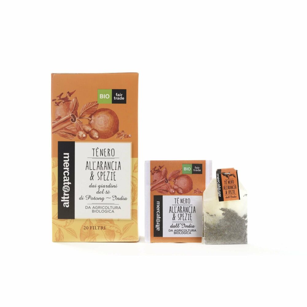 Tè nero bio, qualità BOPF (Broken Orange Pekoe Fannings), aromatizzato all’arancio e spezie. Confezione da 20 bustine.